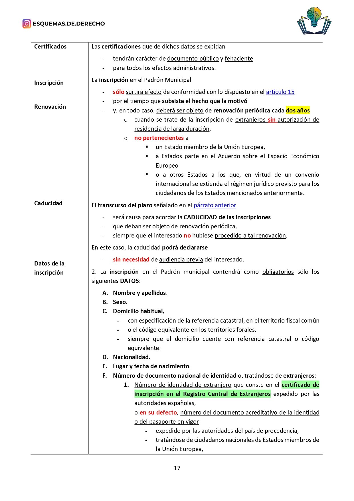 - Revisión Rápida: Facilita las sesiones de repaso, permitiendo una revisión rápida de los temas más importantes antes de los exámenes, o de los datos que deben retenerse a corto plazo, como los plazos o mayorías, sólo tendrás que buscar en la ley los subrayados de color amarillo, naranja o verde.